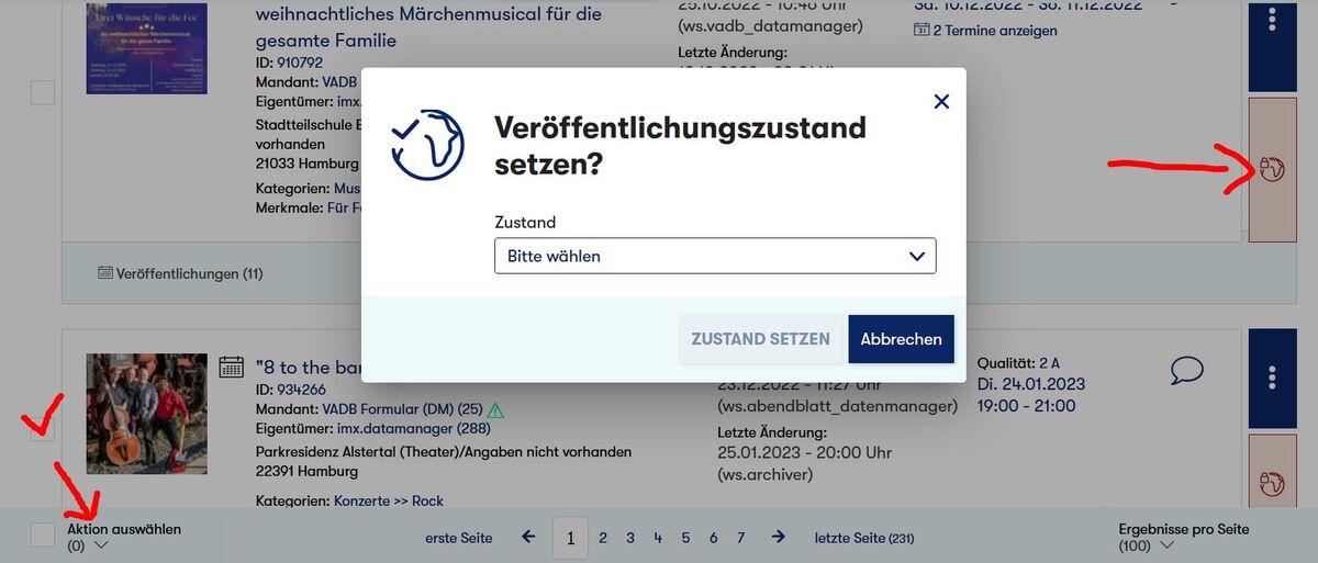 - Ist der gewünschte Datensatz gefunden, kann der Veröffentlichungszustand dieses Datensatzes entweder über das Drop-Down-Menü "Aktion auswählen" oder den Button mit dem Status-Symbol (rote Weltkugel) rechts neben dem Datensatz geändert und damit der Datensatz aktiviert werden. Im sich öffnenden Fenster wird dann der Status „veröffentlicht“ gewählt.